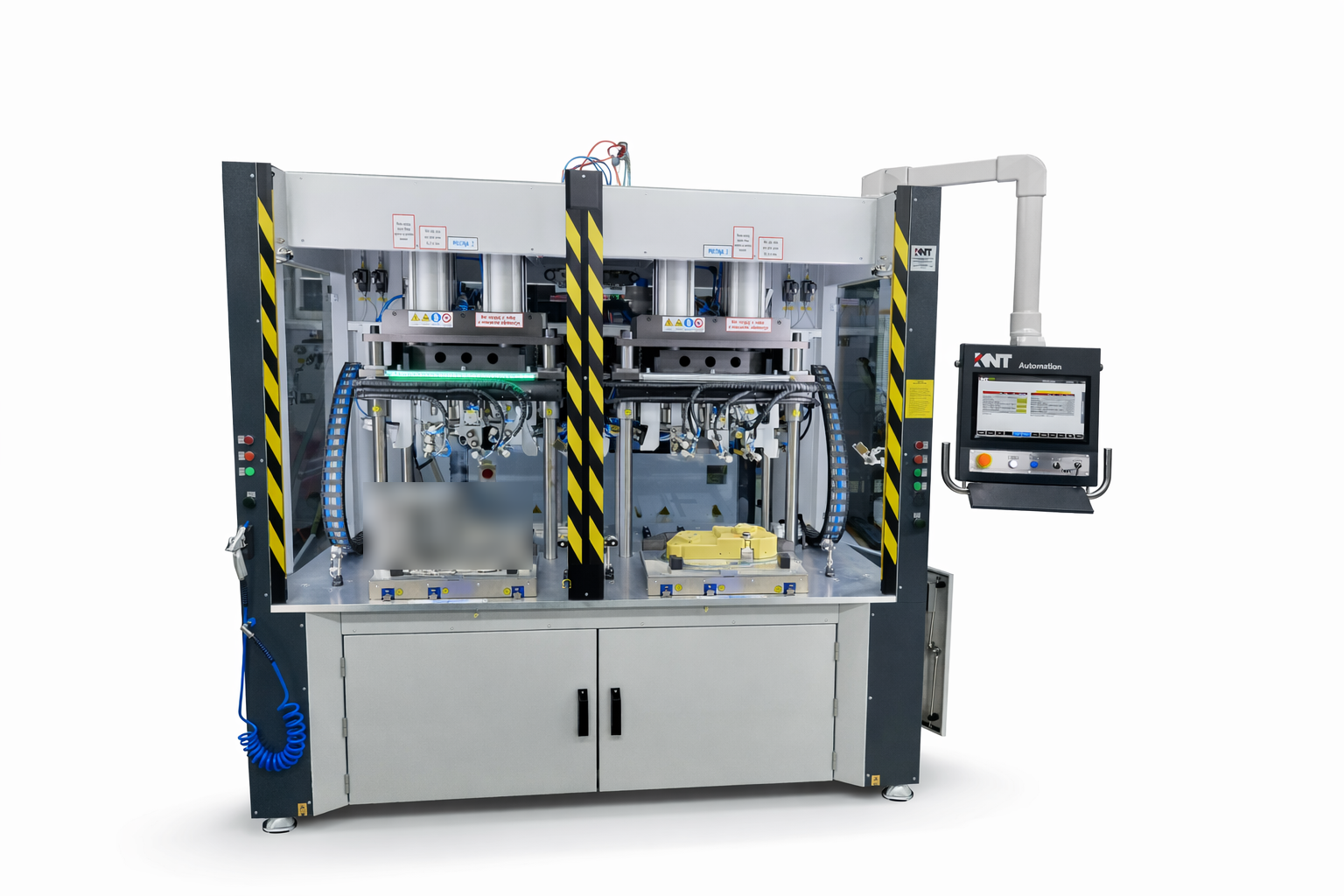 Dichtheitsprüfgerät mit zwei unabhängigen Prüfstationen. Es wird ein Mehrkanal-Messgerät verwendet. Im Rahmen der Prüfung wird ein 2D-Code mit einem Lesegerät ausgelesen und das Ergebnis in einer Datenbank gespeichert.